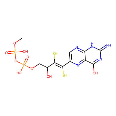 N=c1nc(O)c2nc(C(S)=C(S)C(O)COP(=O)(O)OP(=O)(O)OCC3OC(n4cnc5c(O)nc(=N)[nH]c54)C(O)C3O)cnc2[nH]1Aglycone: