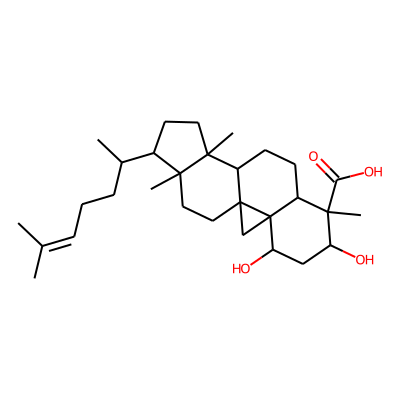 CC(C)=CCCC(C)C1CCC2(C)C3CCC4C(C)(C(=O)O)C(O)CC(O)C45CC35CCC12C| HBA: | 4 | RingCount: | 5 |