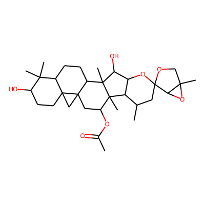 CC(=O)OC1CC23CC24CCC(O)C(C)(C)C4CCC3C2(C)C(O)C3OC4(CC(C)C3C12C)OCC1(C)OC14| HBA: | 7 | RingCount: | 8 |