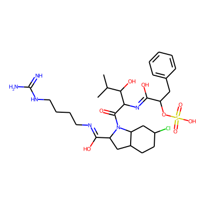 CC(C)C(O)C(N=C(O)C(Cc1ccccc1)OS(=O)(=O)O)C(=O)N1C(C(O)=NCCCCNC(=N)N)CC2CCC(Cl)CC21| HBA: | 14 | RingCount: | 3 |