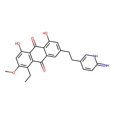 CCc1c(OC)cc(O)c2c1C(=O)c1cc(CCc3ccc(=N)[nH]c3)cc(O)c1C2=O| HBA: | 7 | RingCount: | 4 |