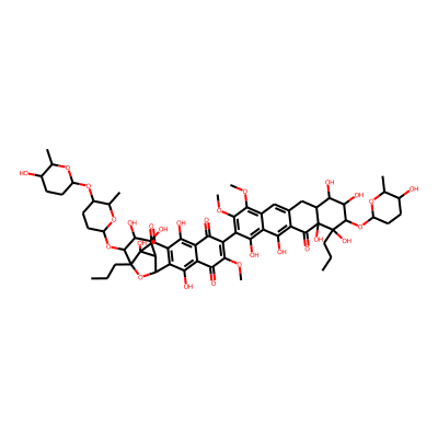 CCCC1(O)C(OC2CCC(O)C(C)O2)C(O)C(O)C2Cc3cc4c(OC)c(OC)c(C5=C(OC)C(=O)c6c(O)c7c(c(O)c6C5=O)C(=O)C5(O)C6C7OC5(CCC)C(OC5CCC(OC7CCC(O)C(C)O7)C(C)O5)C(O)C6O)c(O)c4c(O)c3C(=O)C21O| HBA: | 27 | RingCount: | 12 |