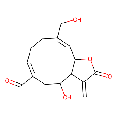 C=C1C(=O)OC2C=C(CO)CCC=C(C=O)CC(O)C12| HBA: | 5 | RingCount: | 2 |