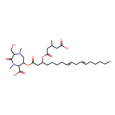 CCCCCC=CCC=CCCCCC(CC(=O)OC1CN(C)C(CO)C(=O)N(C)C1C(=O)O)OC(=O)CC(C)CC(=O)O| HBA: | 12 | RingCount: | 1 |