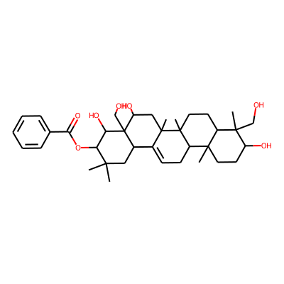 CC1(C)CC2C3=CCC4C5(C)CCC(O)C(C)(CO)C5CCC4(C)C3(C)CC(O)C2(CO)C(O)C1OC(=O)c1ccccc1| HBA: | 7 | RingCount: | 6 |