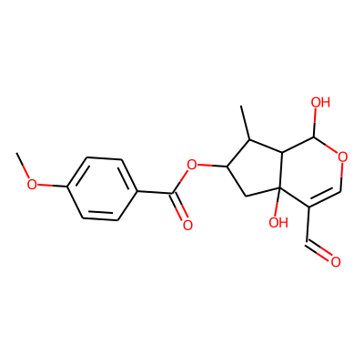 COc1ccc(C(=O)OC2CC3(O)C(C=O)=COC(O)C3C2C)cc1Sugarmoiety: