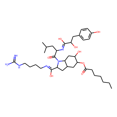 CCCCCCC(=O)OC1CC2CC(C(O)=NCCCCNC(=N)N)N(C(=O)C(CC(C)C)N=C(O)C(O)Cc3ccc(O)cc3)C2CC1O| HBA: | 14 | RingCount: | 3 |