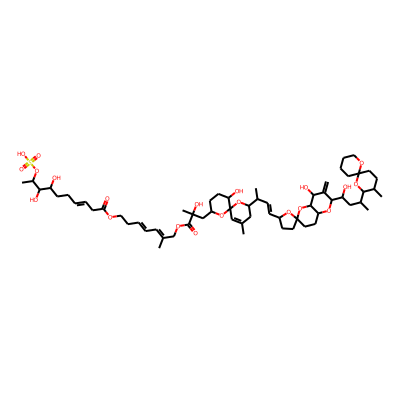 C=C1C(O)C2OC3(CCC(C=CC(C)C4CC(C)=CC5(OC(CC(C)(O)C(=O)OCC(C)=CC=CCCOC(=O)CC=CCCC(O)C(O)C(C)OS(=O)(=O)O)CCC5O)O4)O3)CCC2OC1C(O)CC(C)C1OC2(CCCCO2)CCC1C| HBA: | 21 | RingCount: | 7 |