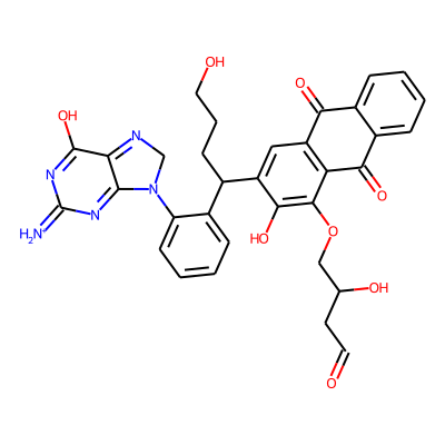 [NH2+]=C1N=C(O)C2=NCN(c3ccccc3C(CCCO)c3cc4c(c(OCC(O)CC=O)c3OC3OC(CO)C(O)C(O)C3O)C(=O)c3ccccc3C4=O)C2=N1Aglycone: