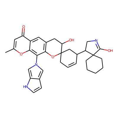 Cc1cc(=O)c2cc3c(c(-n4cc5cc[nH]c5c4)c2o1)OC1(CC=CC(C2CN=C(O)C24CCCCC4)C1)C(O)C3| HBA: | 8 | RingCount: | 8 |