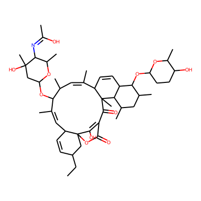 CCC1C=CC2C=C(C)C(OC3CC(C)(O)C(N=C(C)O)C(C)O3)C(C)C=C(C)C3C=CC4C(OC5CCC(O)C(C)O5)C(C)CC(C)C4C3(C)C(=O)C3=C(O)C2(C1)OC3=O| HBA: | 12 | RingCount: | 7 |