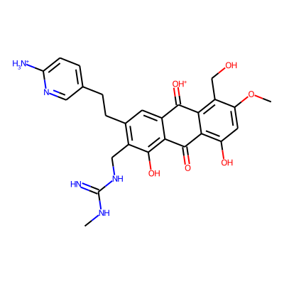 CNC(=N)NCc1c(CCc2ccc([NH3+])nc2)cc2c(c1O)C(=O)c1c(O)cc(OC)c(CO)c1C2=[OH+]| HBA: | 11 | RingCount: | 4 |