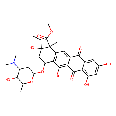 CCC1(O)CC(OC2CC(N(C)C)C(O)C(C)O2)c2c(cc3c(c2O)C(=O)c2c(O)cc(O)cc2C3=O)C1(C)C(=O)OC| HBA: | 12 | RingCount: | 5 |