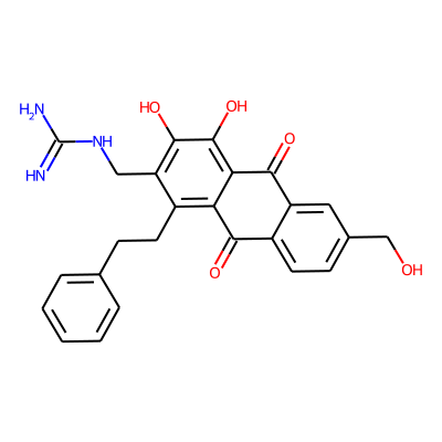 N=C(N)NCc1c(O)c(O)c2c(c1CCc1ccccc1)C(=O)c1ccc(CO)cc1C2=O| HBA: | 8 | RingCount: | 4 |