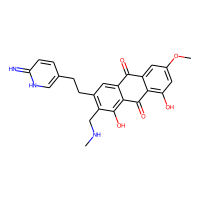 CNCc1c(CCc2ccc(=N)[nH]c2)cc2c(c1O)C(=O)c1c(O)cc(OC)cc1C2=O| HBA: | 8 | RingCount: | 4 |