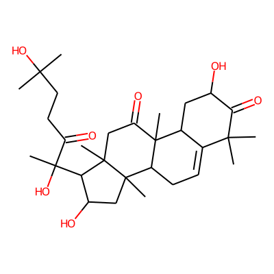 CC(C)(O)CCC(=O)C(C)(O)C1C(O)CC2(C)C3CC=C4C(CC(O)C(=O)C4(C)C)C3(C)C(=O)CC12C| HBA: | 7 | RingCount: | 4 |