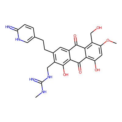 CNC(=N)NCc1c(CCc2ccc(=N)[nH]c2)cc2c(c1O)C(=O)c1c(O)cc(OC)c(CO)c1C2=O| HBA: | 11 | RingCount: | 4 |