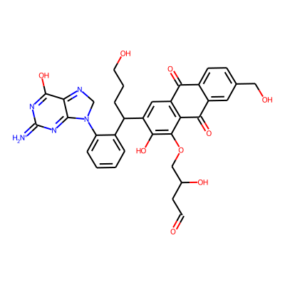 [NH2+]=C1N=C(O)C2=NCN(c3ccccc3C(CCCO)c3cc4c(c(OCC(O)CC=O)c3OC3OC(CO)C(O)C(O)C3O)C(=O)c3cc(CO)ccc3C4=O)C2=N1Aglycone: