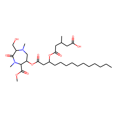 CCCCCCCCCCCC(CC(=O)OC1CN(C)C(CO)C(=O)N(C)C1C(=O)OC)OC(=O)CC(C)CC(=O)O| HBA: | 12 | RingCount: | 1 |