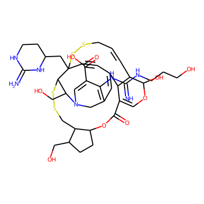N=C(NCCCO)NC1=C2C=C3C#CC4(CC5CCNC(=[NH2+])N5)SSCC=CC5C(O)OC=C(C(=O)OC6CCC(CO)C6CSSC4C(CO)N(C=C1C(=O)O)C2)C35| HBA: | 16 | RingCount: | 7 |