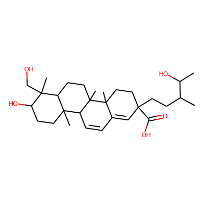 CC(O)C(C)CCC1(C(=O)O)C=C2C=CC3C4(C)CCC(O)C(C)(CO)C4CCC3(C)C2(C)CC1| HBA: | 5 | RingCount: | 4 |