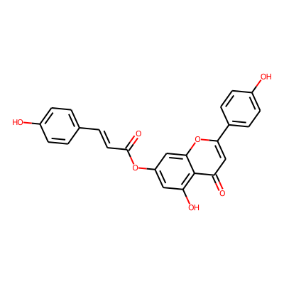 O=C(C=Cc1ccc(O)cc1)Oc1cc(O)c2c(=O)cc(-c3ccc(O)cc3)oc2c1Sugarmoiety: