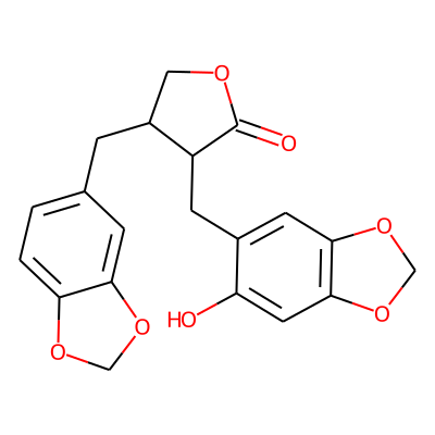 O=C1OCC(Cc2ccc3c(c2)OCO3)C1Cc1cc2c(cc1O)OCO2| HBA: | 7 | RingCount: | 5 |