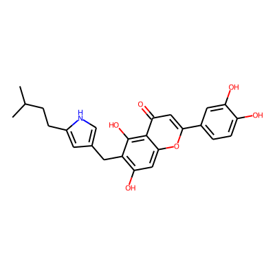 CC(C)CCc1cc(Cc2c(O)cc3oc(-c4ccc(O)c(O)c4)cc(=O)c3c2O)c[nH]1| HBA: | 7 | RingCount: | 4 |